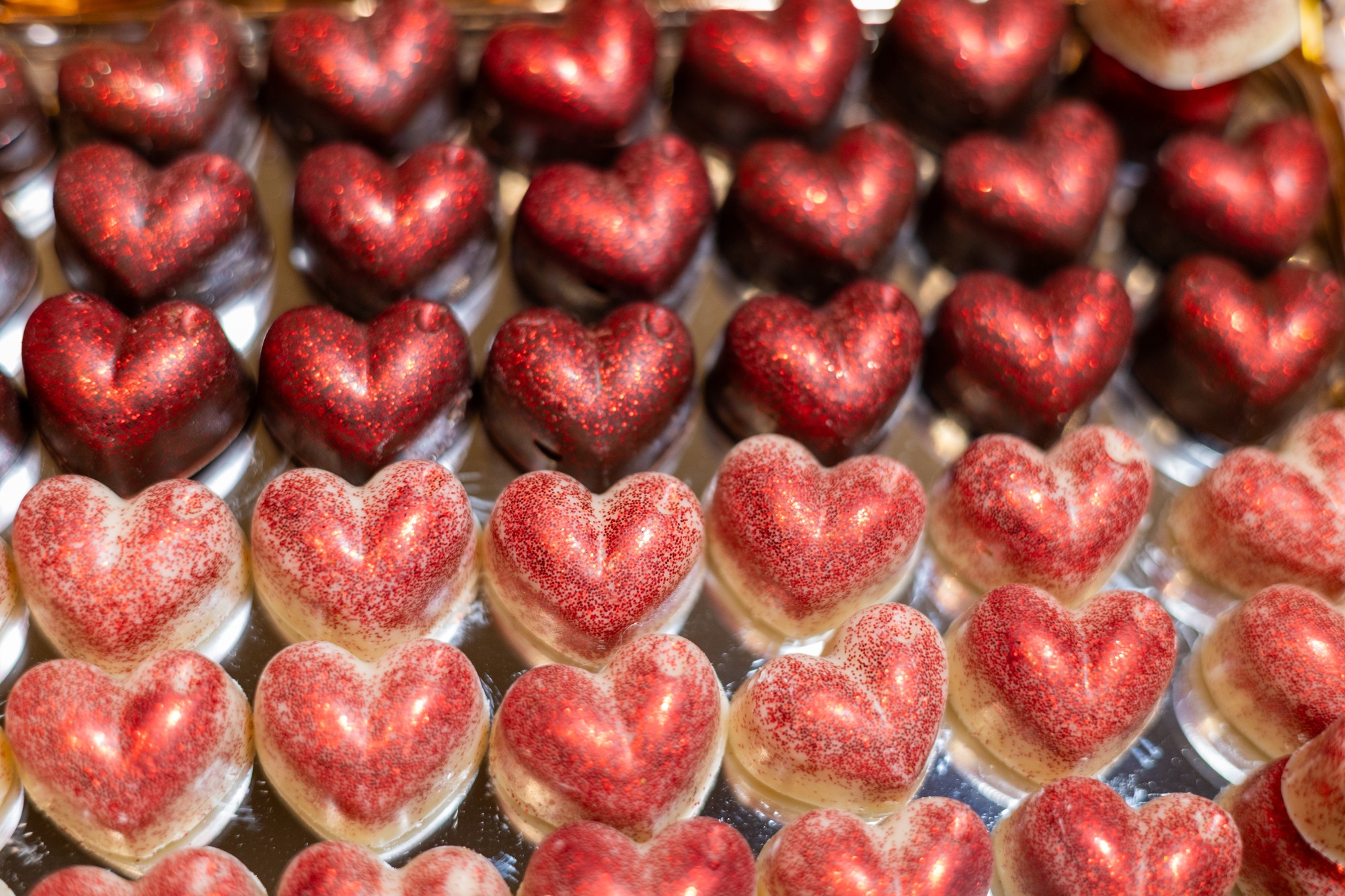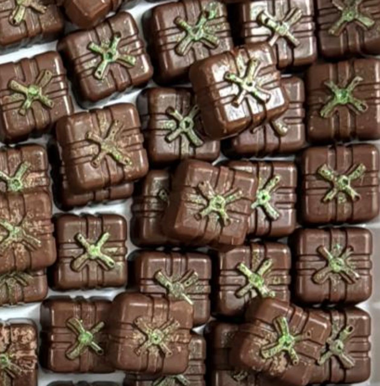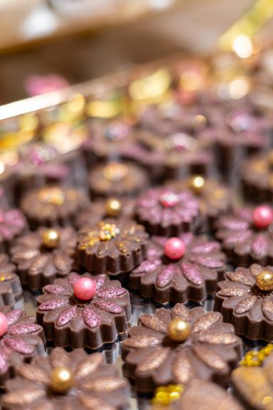 Surtida selección de bombones de chocolate de leche, blanco o negro, con