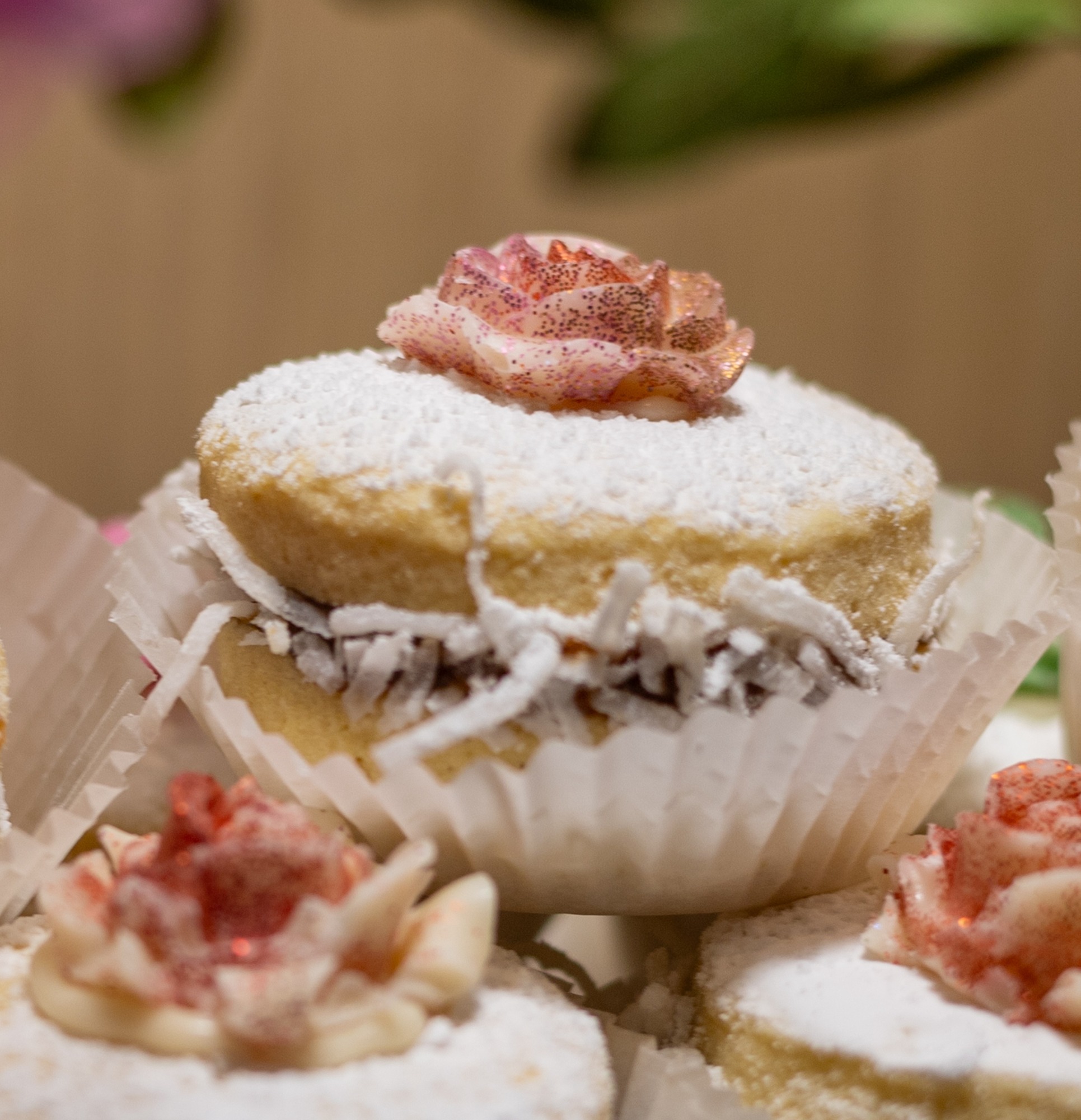 Delicados bizcochos de almidón de maíz con un cremoso corazón de dulce de leche cubierto de coco,